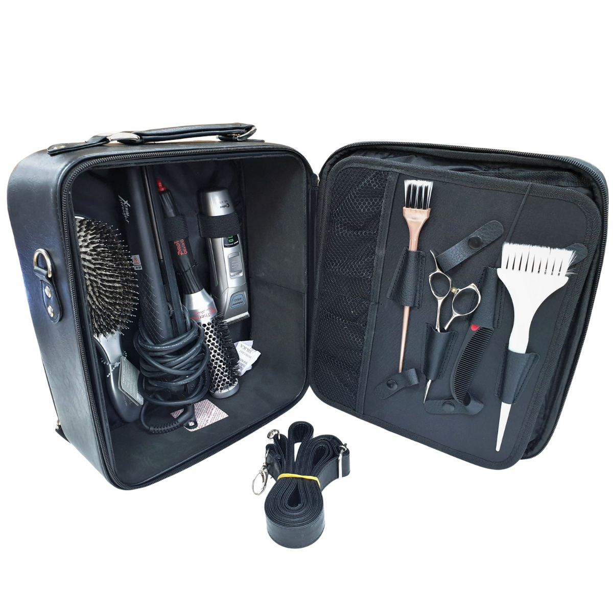 התיק מרשים ואיכותי במיוחד לאחסון ונשיאה (מברשות, מסרקים, מספריים, מחליק, פן וכו') בעל רצועה לתלייה על הגוף.